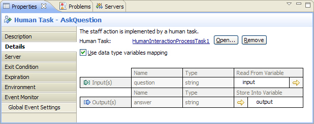 .To complete the implementation of our human task activity, you have to specify the process variables for the activity. Follow these steps: