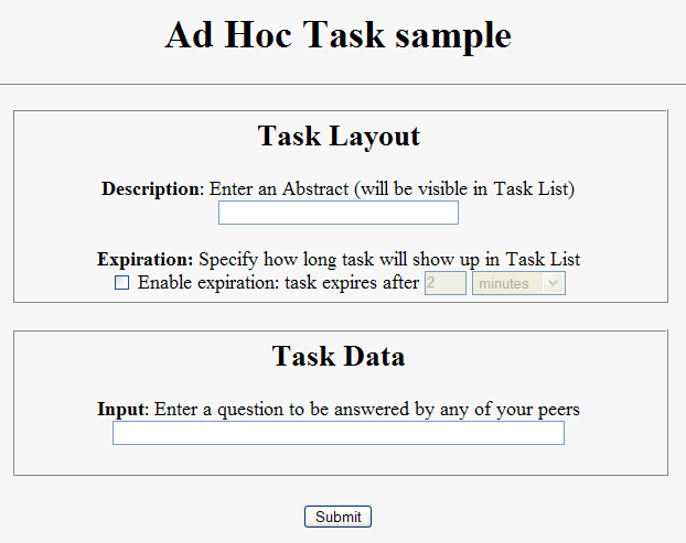 To run this sample, use the client application that is delivered with this sample to define and start Ad-hoc Human Tasks. Then use the Business Process Choreographer Explorer to display and process these tasks.