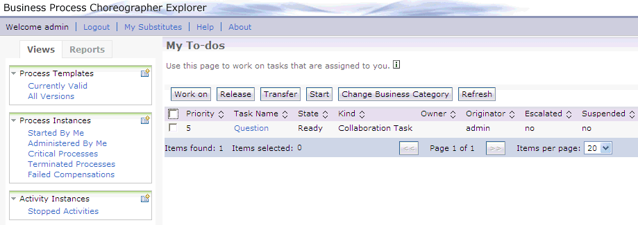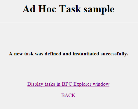 You can now find the newly created task by using the Business Process Choreographer Explorer (BPC Explorer). For your convenience, the response screen contains a direct link to the BPC Explorer application's entry page: Click the Display tasks in BPC Explorer window link to open the BPC Explorer.