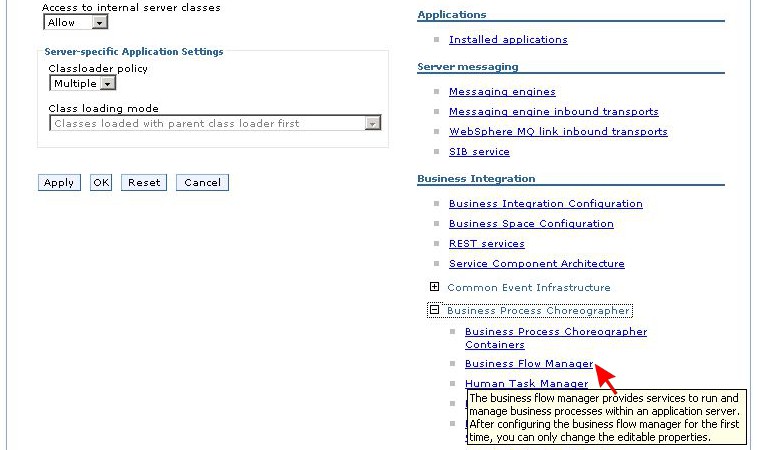Under Business Integration, expand section Business Process Choreographer to find a link to Business Flow Manager.