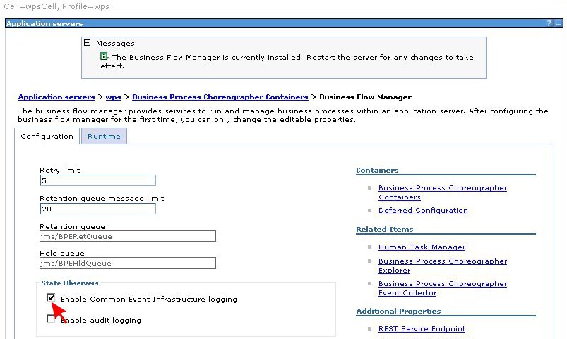 Follow the link to open the Business Flow Manager configuration panel. There is a small framed area titled State Observers with two checkboxes in it. Make sure the checkbox Enable Common Event Infrastructure logging is checked. Then scroll to the bottom of the page and click the Apply button to apply your changes to the configuration.