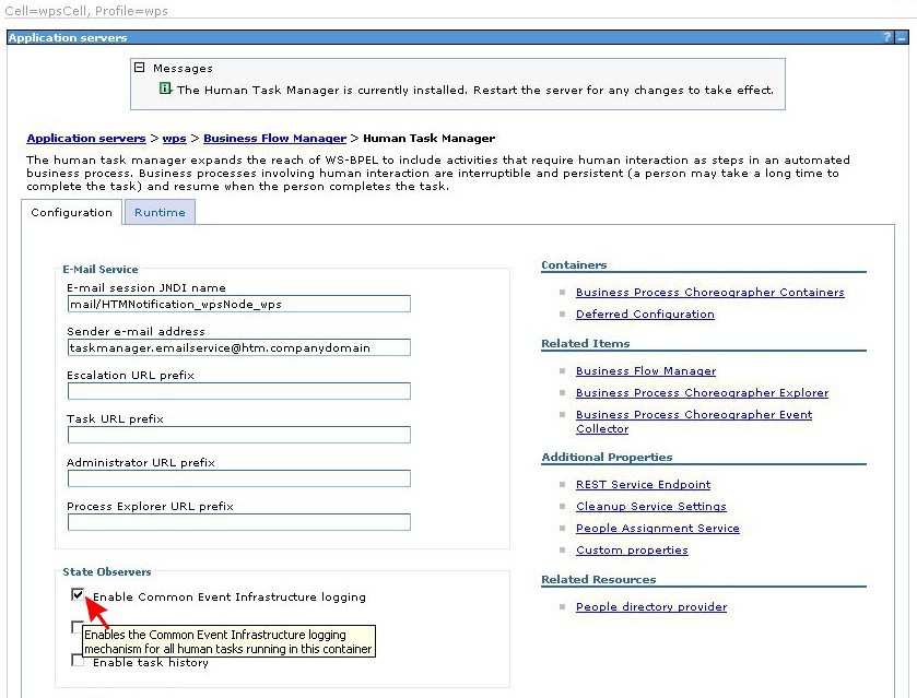 On the right side, in subject area Related Items, a link to Human Task Manager should be available. Click on that link to switch to the Human Task Manager configuration panel. A frame titled State Observers can be found there as well. Again, make sure the checkbox Enable Common Event Infrastructure logging is checked and conclude your review by pressing the Apply button at the bottom of the page.