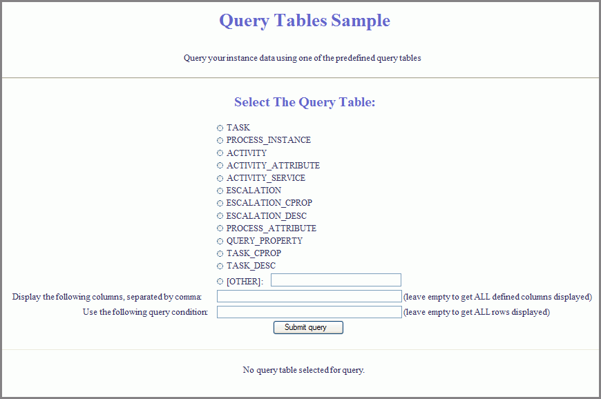 In addition to the predefined query tables for instance data, WebSphere Process Server is shipped with predefined query tables