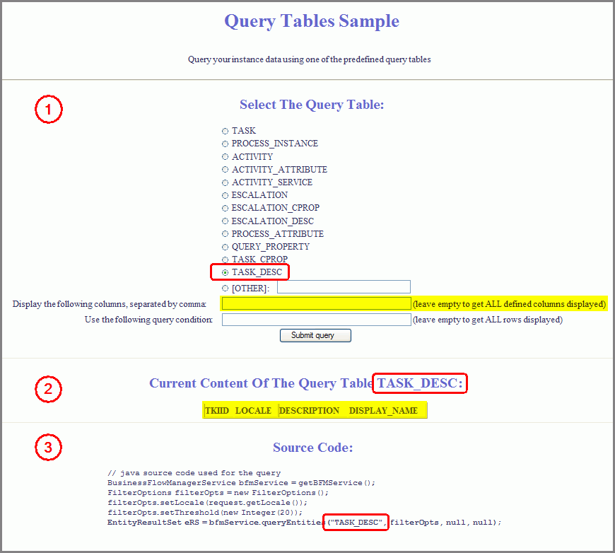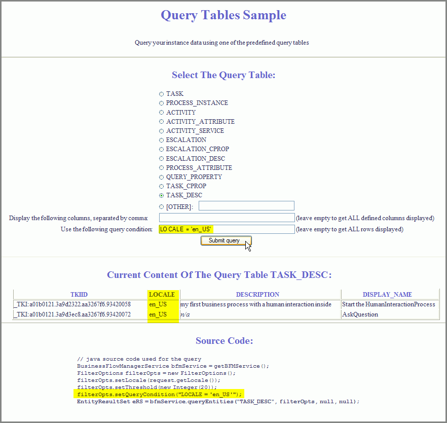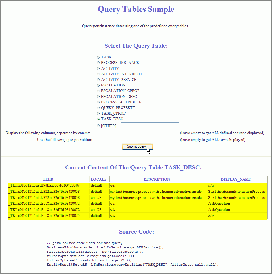 As mentioned previously, a Java code snippet for lauching the query is rendered in the client application. Note that this code snippet is just for illustation purposes, thus you may want to use more setter methods and add error handling to produce reliable code. For a more detailed explanation of the source code, refer to the Code Review section of this sample.