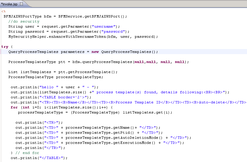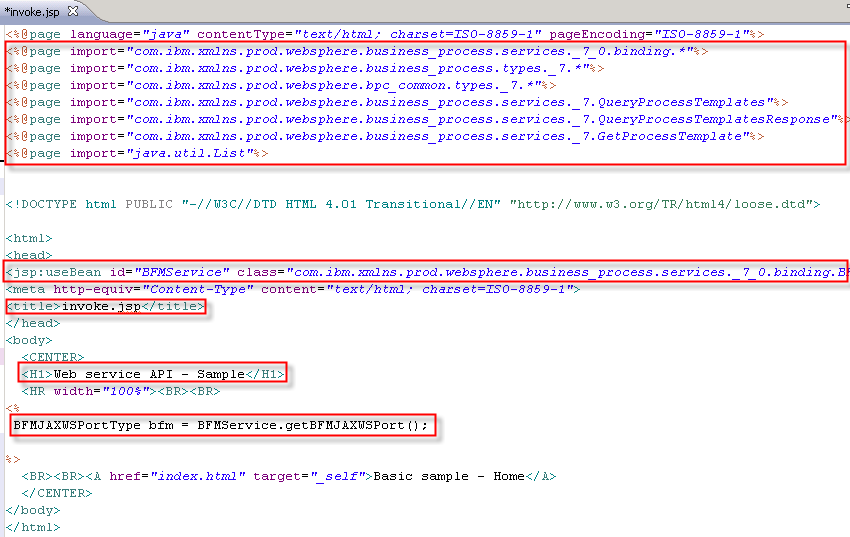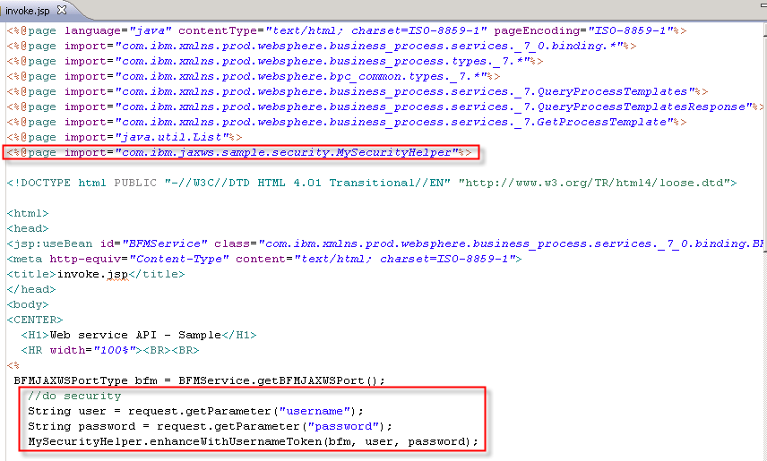 The screenshot below shows the inserted code to the invoke.jsp file to
