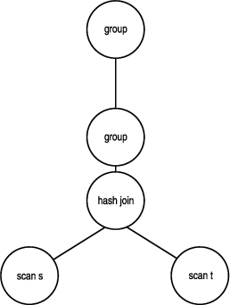The figure below shows an example of an iterator tree. In this example, two scan iterators are below a hash join iterator and above the hash join iterator are two group iterators. This iterator tree is typical for a query that is joining two tables and performing some aggregation afterwards.